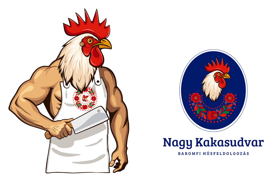 Baromfifeldolgozó vállalkotás logoja élethű kakas és magyar népi motívumok megjelenítésével.