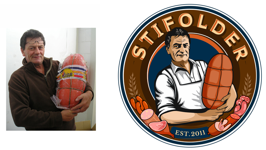 Húskészítmény importőr és nagykereskedő retro logoja az alapító portréjával.