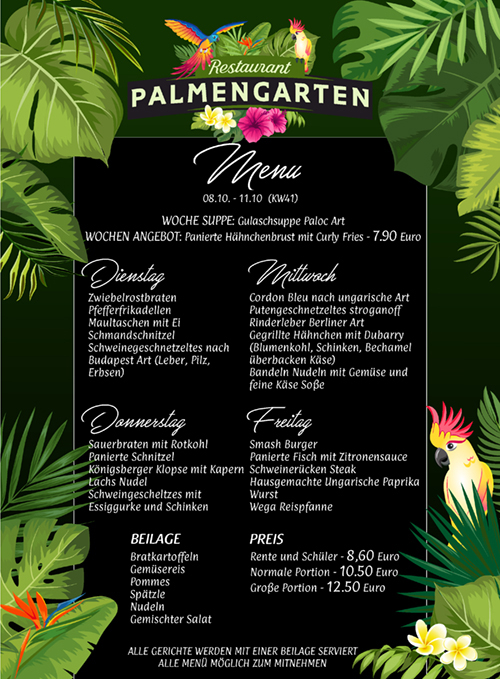 Német étterem - steakhouse, nevéhez illően trópusokat megidéző extra logoja madarakkal, pálmával, egzotikus virágokkal.